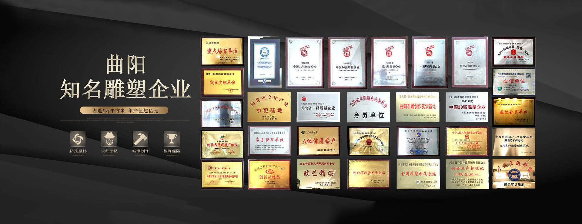 同時,公司也是行業(yè)內(nèi)的佼佼者,連續(xù)七年榮獲“中國20強(qiáng)雕塑企業(yè)”,并被命名為“全國雕塑示范基地”,在國內(nèi)外雕塑藝術(shù)領(lǐng)域享有較高聲譽(yù)。2017年,曲陽縣河北鑫特園林雕塑公司還被文化部、教育部、人社部命名為“中國非遺石雕傳承人群研培實(shí)訓(xùn)基地”。
